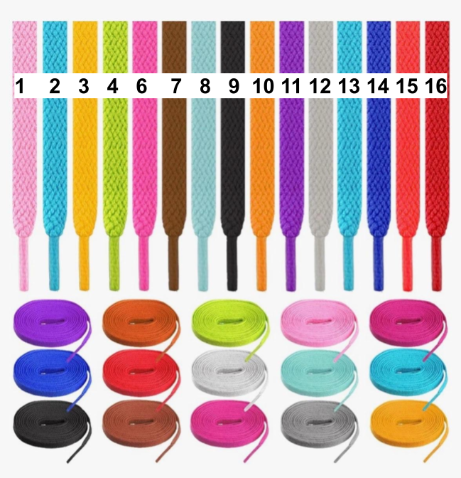 White, Black, Grey, Purple, Green, Orange, Red, Blue, Yellow, Pink, or Brown. See colors in the image below for specific shades (Please specify which number color you want if your not getting white laces)